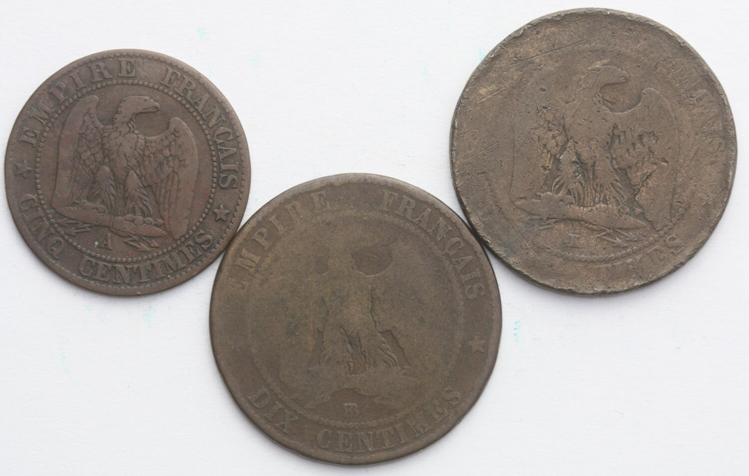Lot 3 szt. Francja, 5 centymów + 2 x 10 centymów 1857/63, st. 4